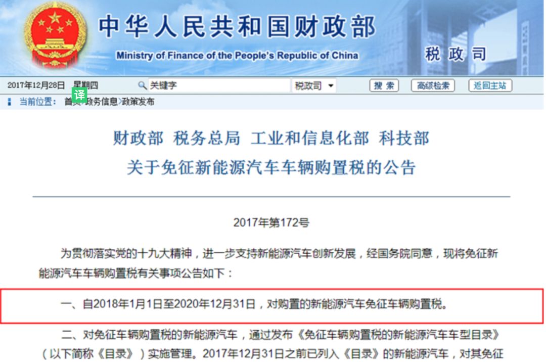 政策:2017年12月27日,財(cái)政部、稅務(wù)總局、工業(yè)和信息化部以及科技部聯(lián)合發(fā)布關(guān)于免征新能源汽車車輛購置稅的公告,公告稱,自2018年1月1日至2020年12月31日,對購置的新能源汽車免征車輛購置稅。對免征車輛購置稅的新能源汽車,通過發(fā)布《免征車輛購置稅的新能源汽車車型目錄》實(shí)施管理。2017年12月31日之前已列入《目錄》的新能源汽車,對其免征車輛購置稅政策繼續(xù)有效 。