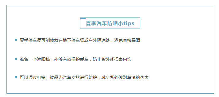 說了這么多的愛車曬傷現(xiàn)象,接下來小編為大家雙手奉上夏季汽車防曬小tips,我們大家一起,好好防曬